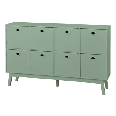 - Features eight storage compartments with grommet hole style door poor pulls and angled legs